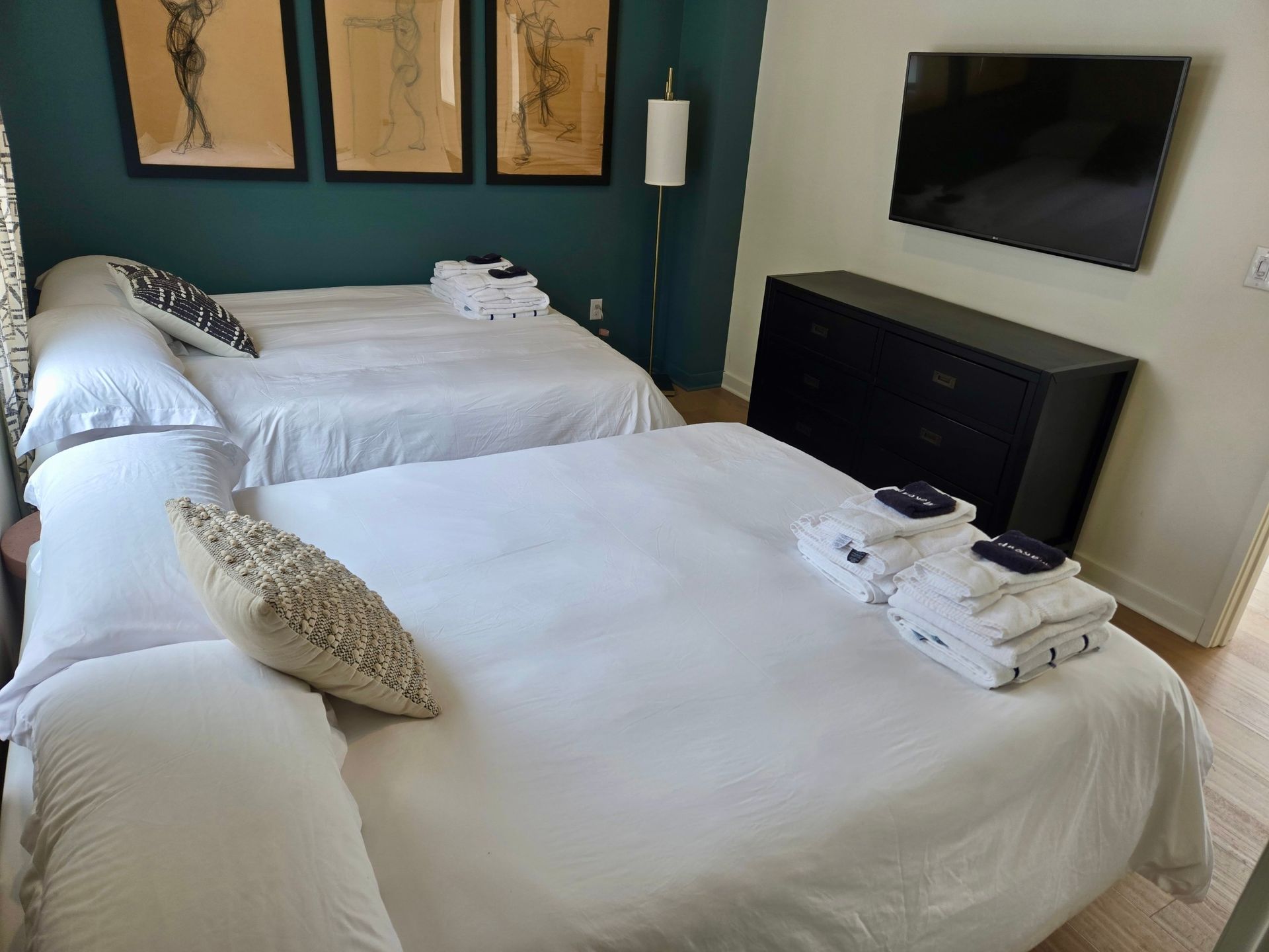 Each bedroom has a queen or king size bed. The first floor bedroom has sliding door access to the front porch and an ensuite shower with shared powder room. The primary bedroom has an ensuite bathroom with a volcanic stone bathtub and private balcony. The twin over full bunk bed is located in the loft common area upstairs connected to a balcony with rocking chairs.